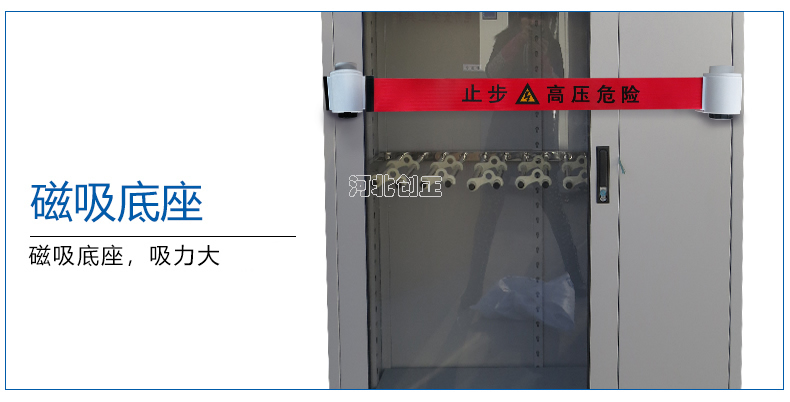警示帶盒是ABS材料制成;帶是錦綸材質(zhì),上面印有“閃電符號(hào),止步,高壓危險(xiǎn)”等字樣。