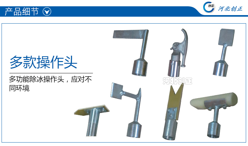 除冰組合工具由絕緣桿和不同的操作頭組成,通過敲、鏟、鉤等方式除去瓷瓶、支架、導(dǎo)線及桿塔上的積雪及覆冰。除冰作業(yè)時,選取操作頭,安裝到絕緣桿的一端并擰緊后使用。絕緣桿分為長、短規(guī)格,根據(jù)現(xiàn)場實際情況進(jìn)行組合。