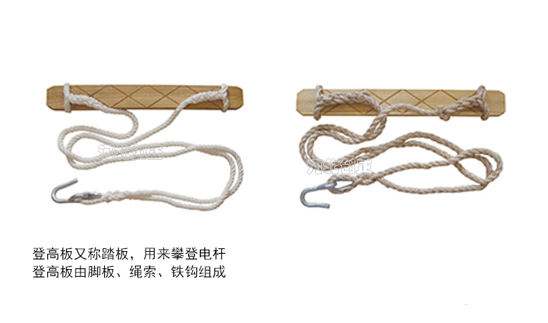 登高板又稱踏板,升降板。用來攀登電桿。登高板由踩板、繩索、鐵鉤組成。踩板用堅硬的木材制成,繩索為16mm多股白棕繩或尼龍繩,繩兩端系結在踏板兩頭的扎結槽內,繩頂部系結鐵掛鉤,繩的長度應與使用者的身材相適應。
