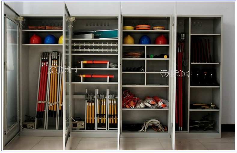 1、柜體是冷軋鋼板卷壓成型,厚度有1.0mm1.2mm1.5mm供選擇。柜體表面采用靜電防腐噴塑工藝,顏色為駝灰色,柜門裝有通體透明鋼化玻璃,透過玻璃可以看到分類有序的工器具。