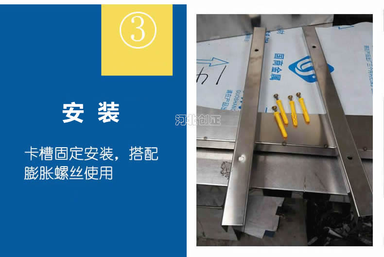不銹鋼擋鼠板安裝簡單,先將膨脹螺釘(內膨脹也叫漲塞)穿入卡槽上的安裝孔,再將兩側的卡槽沿門框將膨脹螺釘平行固定到門框兩邊墻體上,卡槽安裝成功。使用時把擋鼠板順卡槽的內徑滑入卡槽之中。不用時將擋鼠板取出,固定在墻體上的卡槽不影響門的正常開關,不用取下。