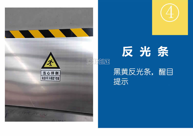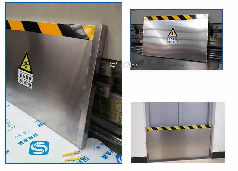 不銹鋼擋鼠板表面經防腐處理。擋板上部貼有黃黑相間的反光條,起到警示作用。